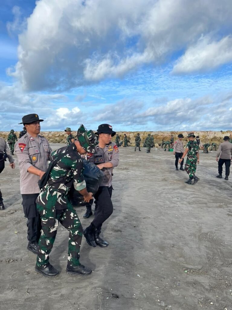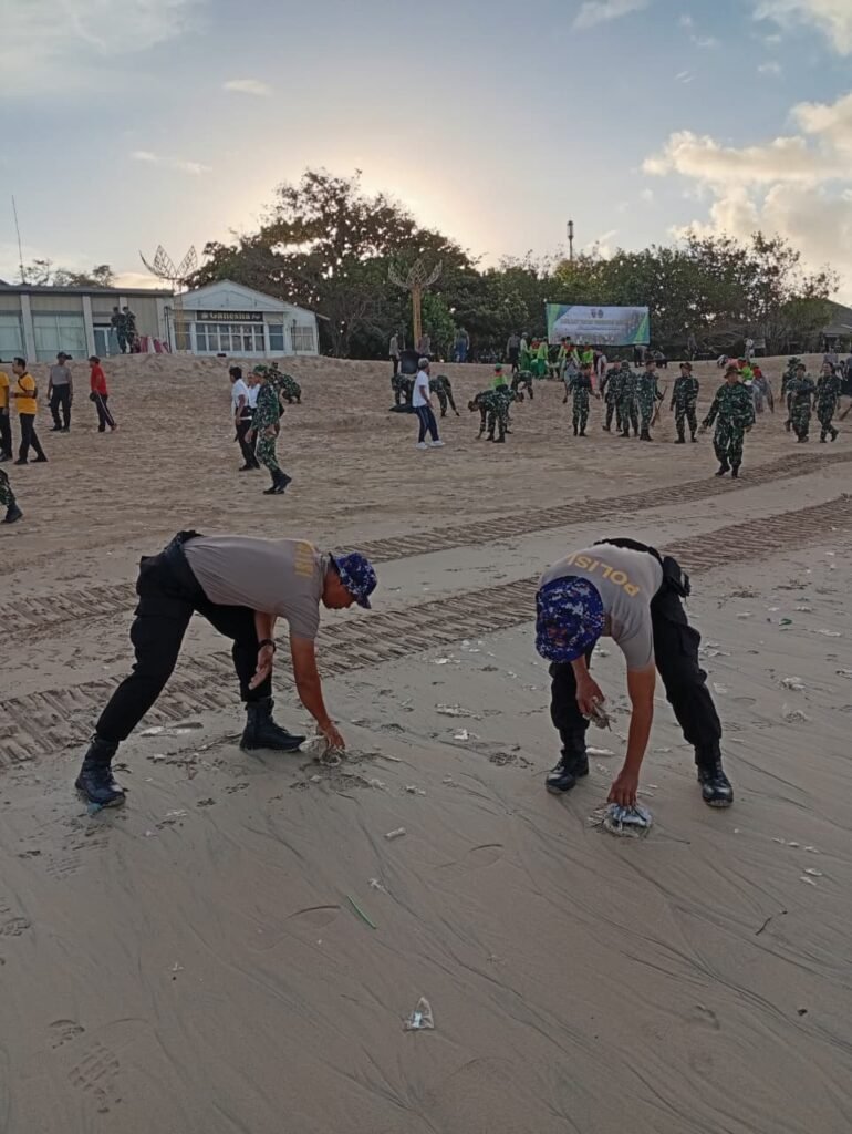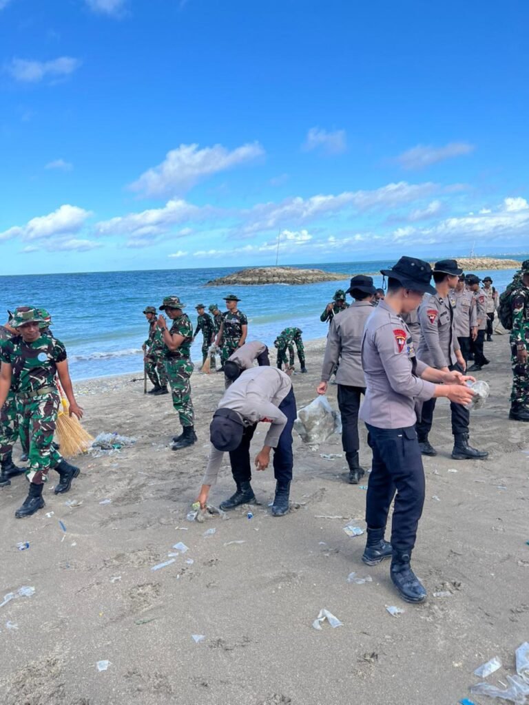 Kegiatan tersebut melibatkan personel TNI-Polri, masyarakat setempat, serta pengelola kawasan pantai. Para peserta aksi karya bakti secara gotong royong membersihkan sampah plastik, kayu, dan berbagai limbah lainnya yang terbawa arus laut dan tersebar di sepanjang garis pantai.